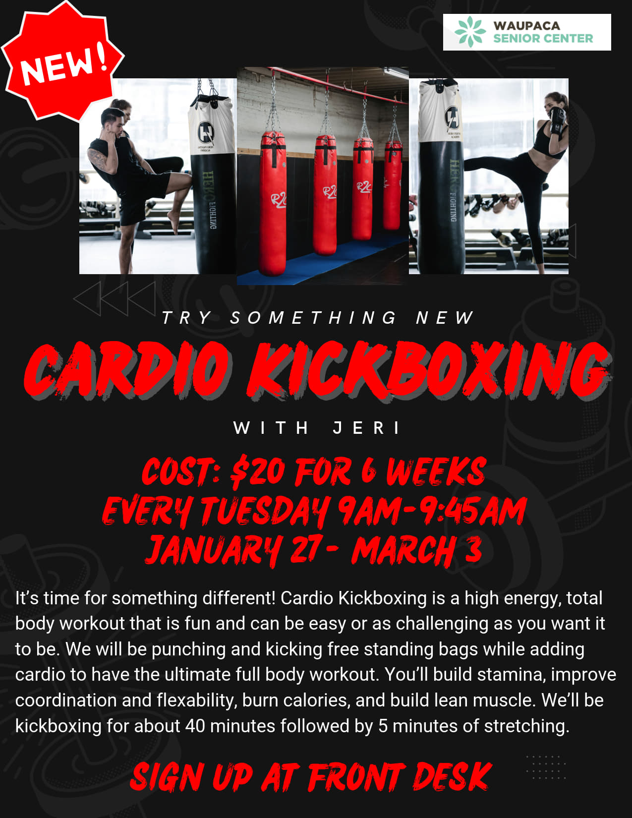 Cardio Kickboxing Related Date Feb 03 2026 Expired! Time 8:00 AM - 6:00 PM Location Waupaca Recreation & Senior Center 407 School Street, Waupaca, WI 54981 Category Senior Center Share this event