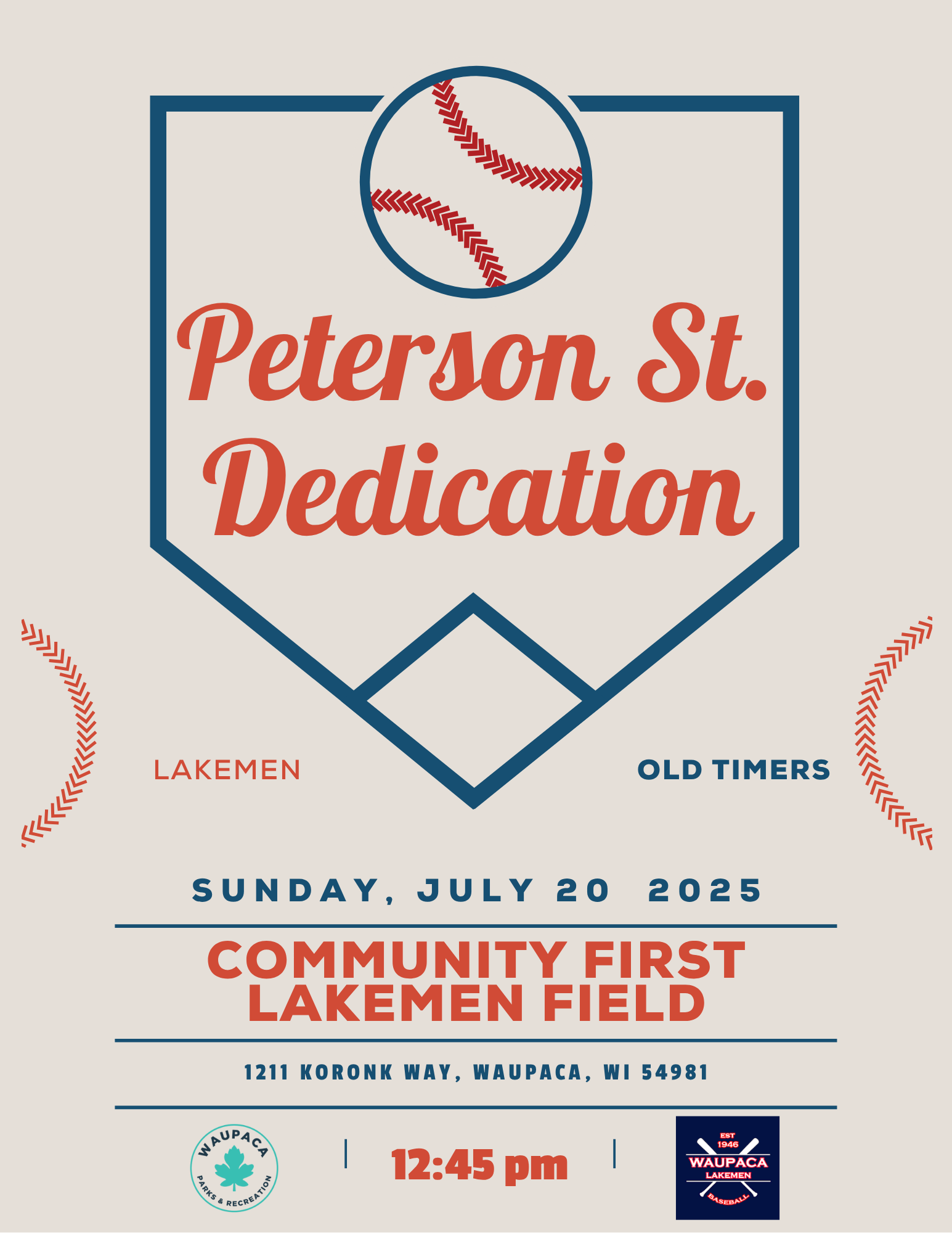 We are proud to announce the Peterson Street Dedication Ceremony. You are invited to attend. Please see the attached flyer for details. Come early to watch the old timers play and stay through the afternoon to watch the Lakemen vs. Hortonville Stars starting at 1:30.