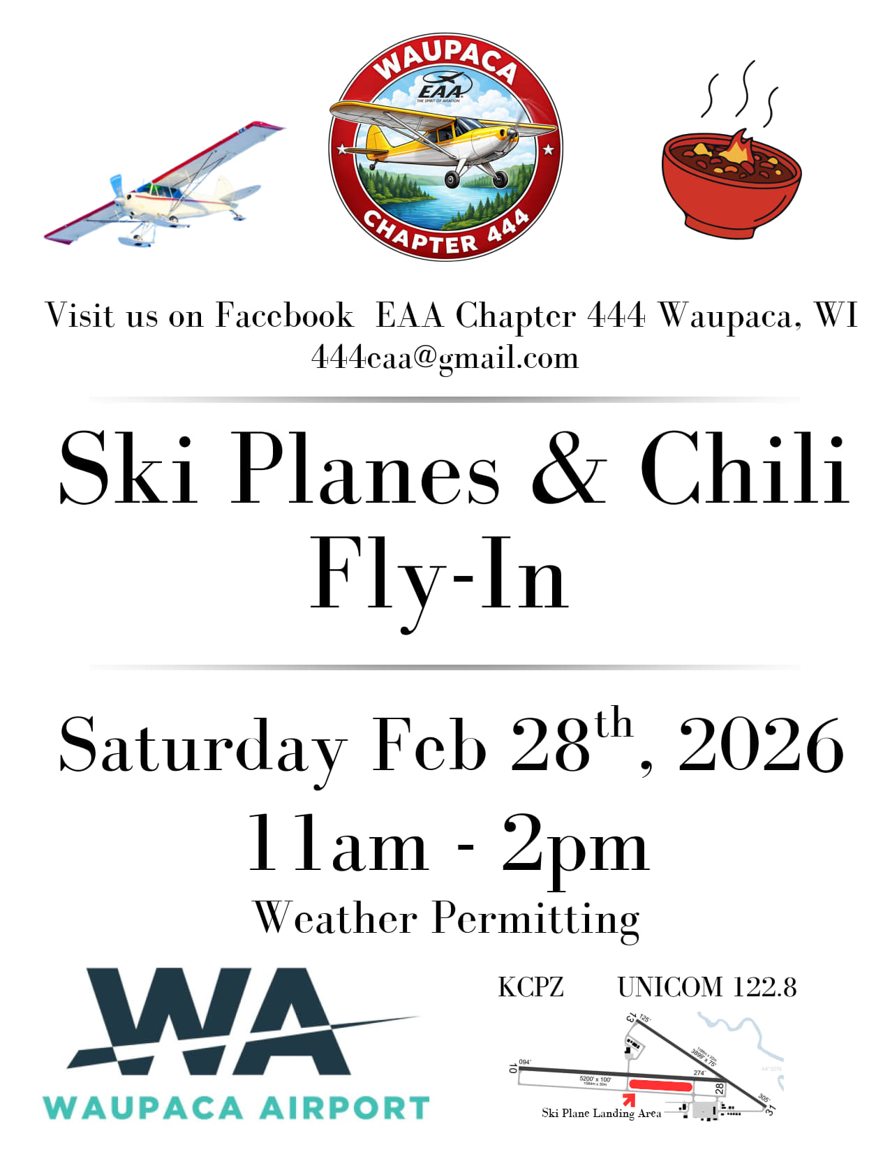 Ski Planes & Chili Fly-In Related + Add to Google Calendar + iCal / Outlook export Date Feb 28 2026 Time 11:00 AM - 2:00 PM Location Waupaca Airport 2601 Runway Drive, Waupaca, WI 54981 Category Airport City Events Community Events Share this event